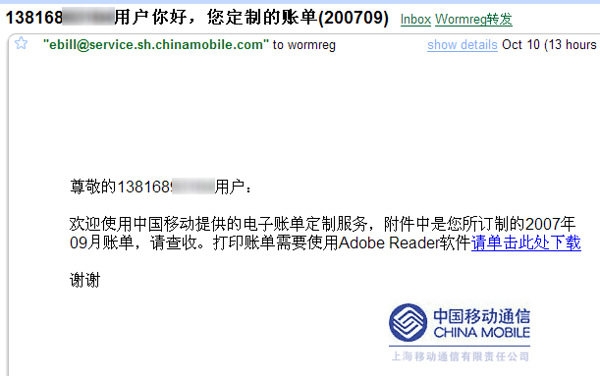 我定制了中国移动的Email账单, 今天第一次接收到.