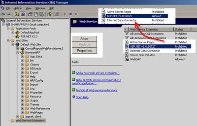 打开IIS管理器, 找到"Web service extension", 会发现右边有个列表, 其中有我们熟悉的"ASP.NET v2.0.50727", 状态是"Prohibited", 选中该条记录, 点击左边的"Allow"按钮. 就可以了.