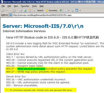 IIS Lockdown是IIS6的新特性, 可以允许用户禁止一些不用的Web Service Extensions, 这样会让IIS更安全. 客户端访问IIS的时候, 如果遇到了IIS的某个扩展被禁用的时候, 会得到普通的404错误, 但是查看IIS日志就会发现是404;2错误, 而不是单独的404. 在IIS6之前, 微软有个程序叫做"IIS Lockdown", 也是做这个事情的, 可以禁用某些扩展名映射等.