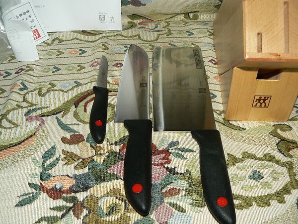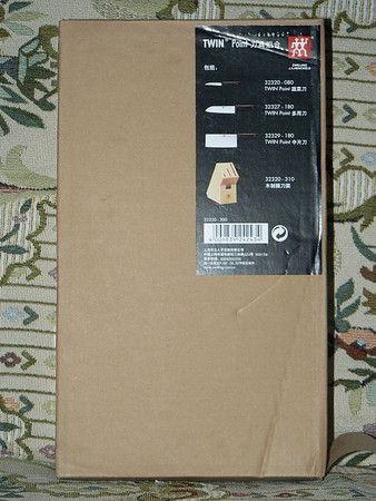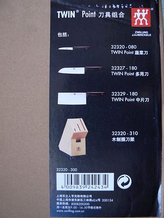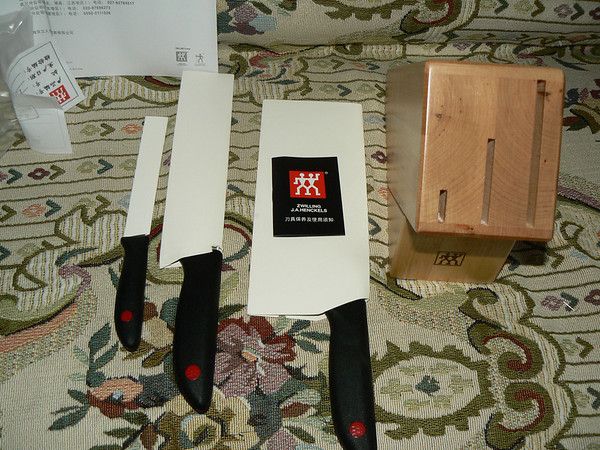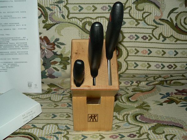 上个月招商银行有个十全十美活动, 3把双立人刀+刀架只要200元, 这绝对是很划算的. 想想超市里卖的带刀架的杂牌刀都要一两百, 200元买双立人是相当合算的. 于是乎, 在9月份刷卡5次后, 就订购了这款双立人 Twin Point插刀架4件套.