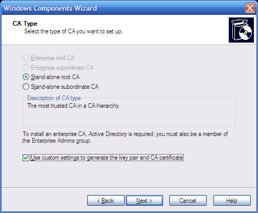 1. 点击"Next"按钮, 让你选择CA的类型, 由于我们是自己做独立的CA, 所以选择"Stand-alone rootCA"