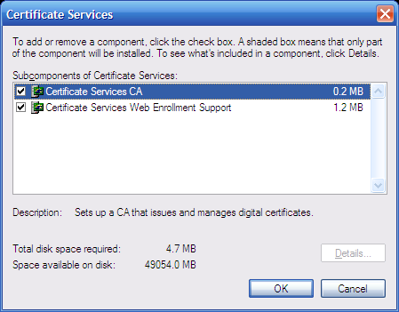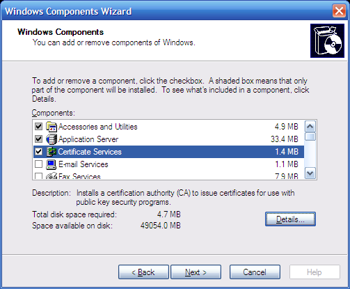 2. 勾选Certificate Service前面的勾, 并且要保证该组件里面包含的两个组件都被选中