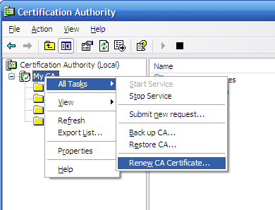 这时可以在左边的CA节点上点击右键, 选择Renew, 然后重启CA, 应该就可以了.(已经测试)