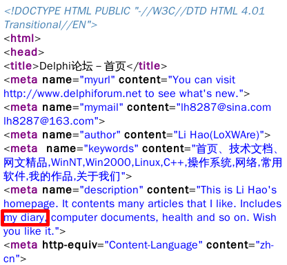 这是我最开始确立写网络日记的时候,页面代码的截图,可以很明显看到,我建立这个网站的其中一个原因就是写日记。