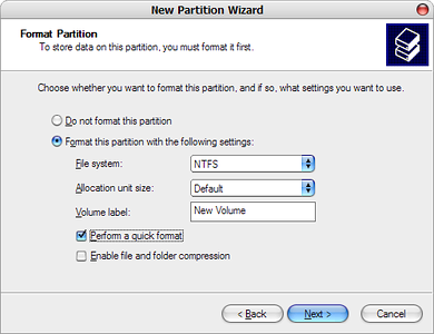 点击"下一步"后, 选择快速格式化, 这个分区的文件系统是NTFS或者FAT32都没关系.