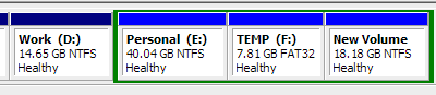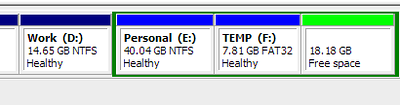 首先鼠标右键点击桌面上的"我的电脑", 选择"管理", 打开后, 选择"磁盘管理", 会看到系统中的硬盘数量, 每块硬盘的分区等. 从下图中可以看到我还有一个18.18G的空闲分区.