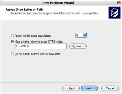 在接下来的向导中, 不要选择"为驱动器制定盘符", 而是选择"将它装载到一个空的NTFS文件夹"