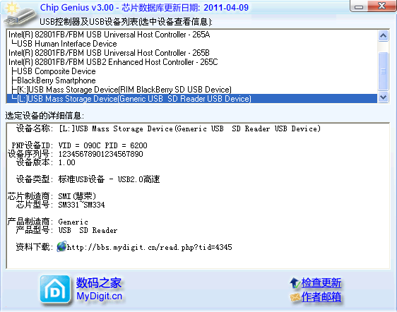 我之前听说过U盘有个主控芯片,芯片好坏决定了读写速度,以及稳定性。那么会不会是主板不兼容这个读卡器芯片呢?Google了一下,发现真可能是芯片问题。有个软件叫ChipGenius,可以检查各种USB设备的主控芯片厂商和型号。下载这个软件后,发现以前那个工作正常的SD读卡器芯片是SMI慧荣的SM331-SM334。新买的TF读卡器没检测出来芯片,根据VID和PID查了一下,可能是SuperTop的,型号未知。移动硬盘也是查不出芯片,但是能引导系统。